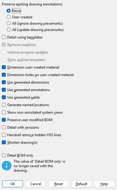 is checked, detailing updates the member bill of material to match the model, but does not change the drawing.