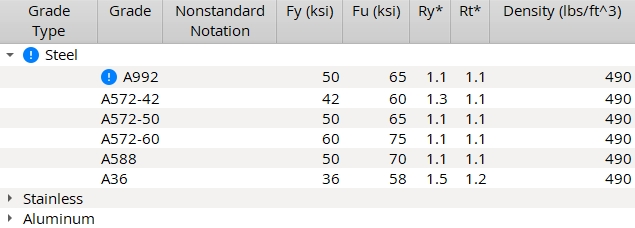 | ASD/LRFD/CISC | Grade Type, Grade, Nonstandard Notation, Fy, Fu, Ry, Rt, Density | shown when an ASD, LRFD, or CISC Connection design method is selected. |