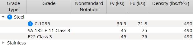 | AS4100 | Grade Type, Grade, Nonstandard Notation, Fy, Fu, Minimum Thickness, Maximum Thickness, Density | shown when AS 4100 is the Connection design method. |
