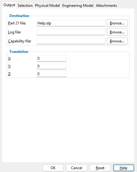 Part 21 file: The file name of the CIS2-compliant file that you want to generate. The default file name is the name of your current Job plus an .stp extension. The default folder into which this file is placed is set per User and Site Options > Output > Export Model.