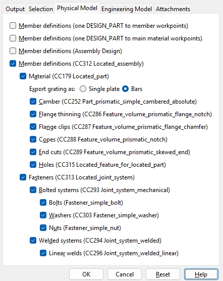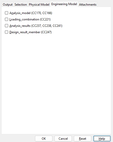 Options under the Engineering Model tab allow various aspects of the SDS2 Engineering model of your current Job to be exported in a CIS2 file. The relevant conformance class ( CC ) is placed in parenthesis for the selection options on this window. The conformance class is a reference to volume 5 of the CIS2 standard ( Conformance Requirements ).