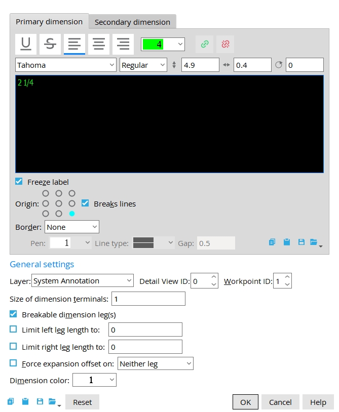 Secondary Dimension: An additional dimension label that appears below the main (primary) dimension line on a drawing. It is typically used to show the same measured distance in an alternate unit. The same settings apply here as they do for the Primary Dimensions.
