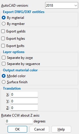 Export DWG/DXF entities: By material or By member. When By material is selected, faces are grouped as materials. When By member is selected, faces are grouped as members, making it easier to select a member in its entirety in whatever program is used to view the imported DWG/DXF file.
