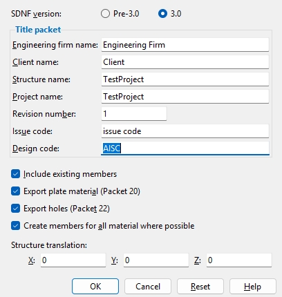 Select Pre-3.0 if you want Export Model to generate a steel detailing neutral file for older versions of the Intergraph Framework program. The file will not include Packet 22 (hole information).
