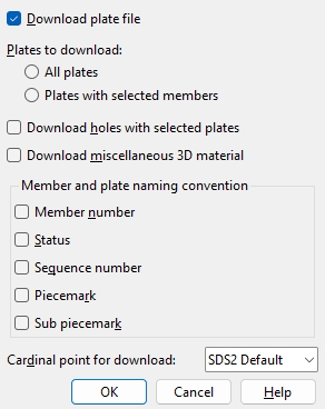 Cardinal point for download: SDS2 default or 1 or 2 or etc. This applies to straight rolled section or plate members only; it does not apply to curved or bent members. If you do not wish to use the SDS2 Default, then select the cardinal point on the member's section profile that corresponds to the workline of the member.