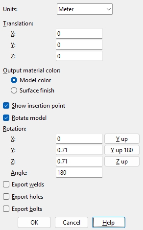 Rotate model is checked. The global coordinate systems of modeling software typically have X, Y and Z axes. In other software, the Y axis may be the elevation axis. To enter a User specified transformation, type in the exact X, Y, Z values andAngle that you want. Y up exports the model with transformations in the file that make the Y axis point up. Y up 180 is the same as Y up, but rotates the model 180 degrees. Z up maintains the model orientation that exists in the SDS2 3D model, which would be the same as leaving